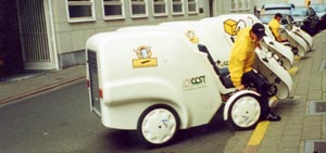 Pupnet - a revolutionary shopping concept; When Stefan van Baelen arrived from Antwerp to discuss his new business idea I must confess that it looked extremely ambitious, and fraught with potential difficulties. Any cycle based business proposal that involved winning the support of major international retailers, an extremely complex software development project, a highly technical engineering plan, major civil engineering works and the complete co-operation of a large City Council seemed to ambitious a project to contemplate. Not to mention considerable personal investment by the designer! Fortunately I underestimated Stefan`s drive and his ability to move mountains. Four months after our initial conversations we found ourselves delivering a shiny new fleet of six vans Stefans premises in Antwerp. Let me explain the PupNet concept; Antwerp is the pilot city for a project that Stefan hopes will be adopted by many other cities throughout the world. The Pickup Point Network [Pupnet] is a hands free shopping scheme designed to relieve shoppers of the burden of carrying their days purchases around a busy city centre, freeing them to do other activities such as visiting theatres and restaurants. It is also designed to relieve city centre traffic congestion and boost retail trade. Too good to be true? Read on ... Stefan has installed a high tech outdoor locker system [see photo] in each of the three park and ride car parks situated on the outskirts of Antwerp. Shoppers park their cars and continue into the city by the trams which conveniently stop by the locker stations. Members of the Pupnet scheme are given “Smart” cards, and when they make their purchases they hand the card to the retailer who logs them onto the pupnet system and allocates a locker to them in the relevant car park that they have left their car in. The shopper leaves his/her purchases at the relevant store[s], [ the majority of shops in Antwerp centre participate in the scheme] and continues to enjoy the sights of Antwerp. At regular intervals during the day the fleet of AVD Vans collect all the purchases from the participating stores and deliver them to the relevant locker bank. At the end of the days shopping the shoppers make their way out of Antwerp on the trams back to the car parks. They go to the locker bank and insert their card into the ATM type receiver which automatically interrogates the card and opens the allocated locker. The customer collects the days purchases, loads them into the car and drives home. We are proud that our equipment was chosen to be part of such cutting edge and ambitious scheme. Stefan is tirelessly promoting the Pupnet concept to interested city fathers around the world. We wish him every success with this extraordinary project and hope to see Stefans ideas get the worldwide acceptance that they deserve. NinComSoup - London based premium food supplier When Ben Page-Phillips, founder and MD of NinComSoup was looking for a unique eye catching delivery van to launch his new premium soup delivery service, he decided that the AVD Van was the ideal solution. Their range of beautifully prepared home made soups needed a delivery vehicle that could project this image for their unique product, NinComSoup pride themselves on the quality of their fine food and service. AVD are proud to be associated with such a forward thinking, innovative company, look out for their Van with its distinctive livery on the busy streets of London. <Go Back |